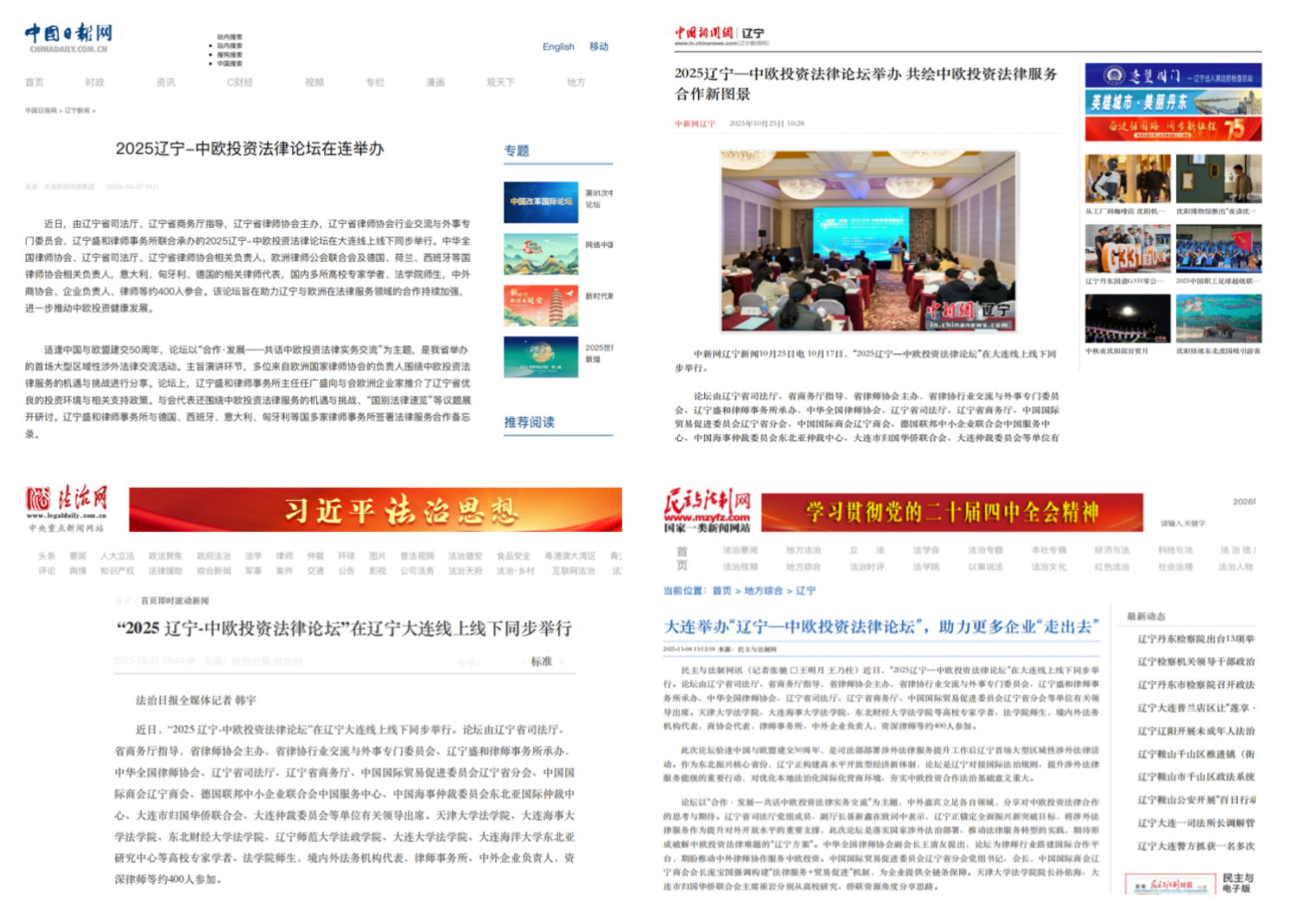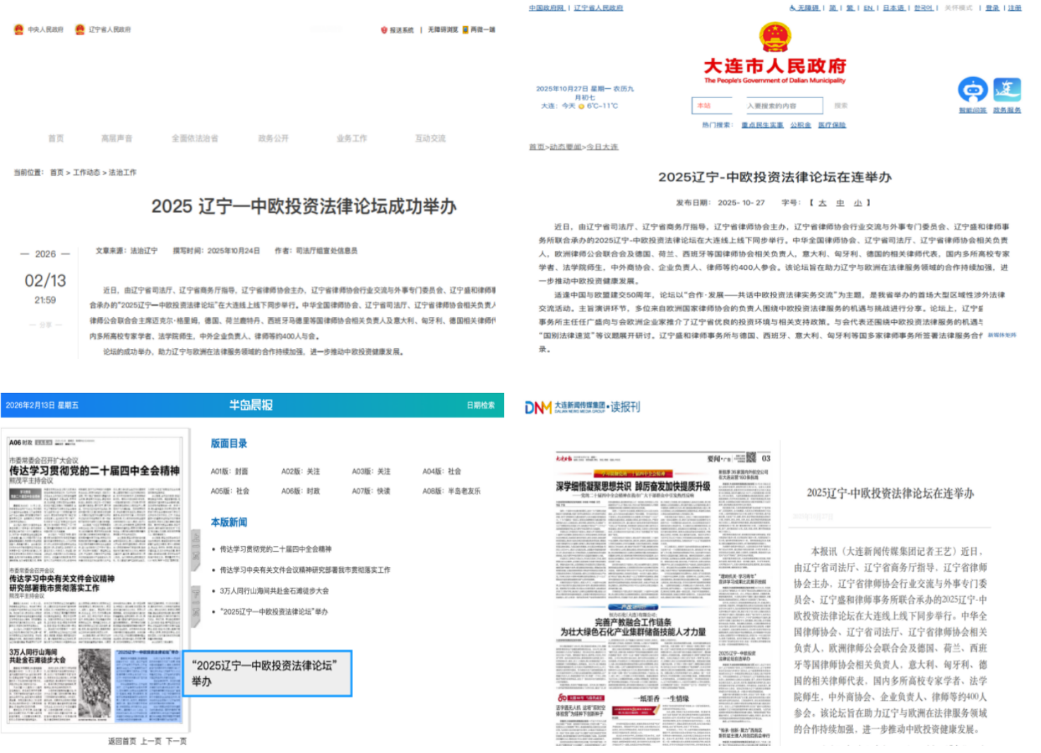 The successful hosting of the 2025 Liaoning · Sino-European Investment Law Forum established a regional platform for international legal cooperation. The forum also received extensive, multi-channel coverage from nearly 20 relevant institutions at the central, provincial, and municipal levels, including China Daily, China News Service, Legal Daily Online, Democracy & Rule of Law Network, China Lawyers, as well as the People's Government of Liaoning Province and the People's Government of Dalian Municipality. As the organizing law firm of this forum, Liaoning Sun-land Law Firm has remained committed to transforming the outcomes of high-level dialogue into a solid bridge supporting Chinese enterprises in their global expansion journey, continuing to move forward with unwavering dedication.